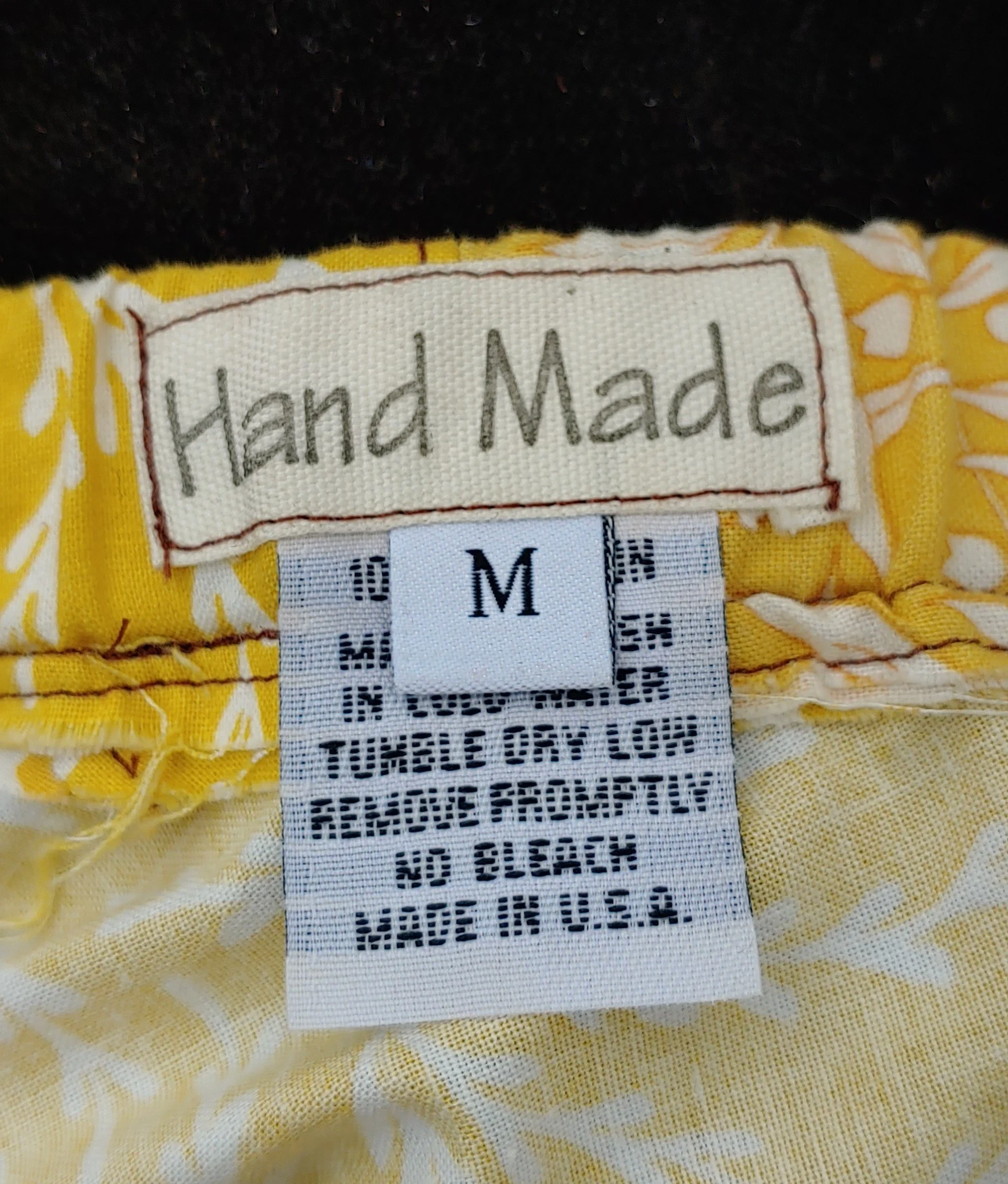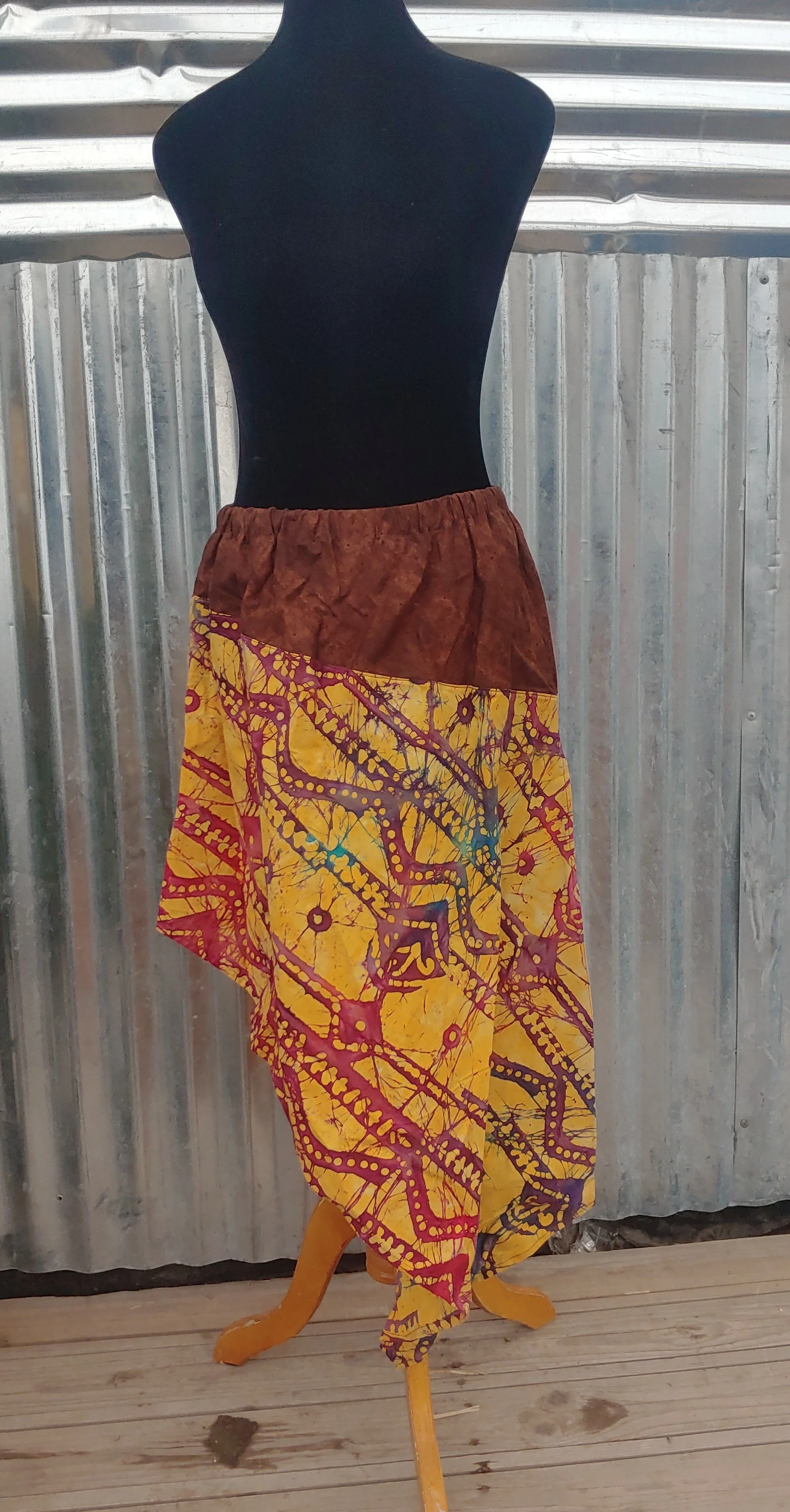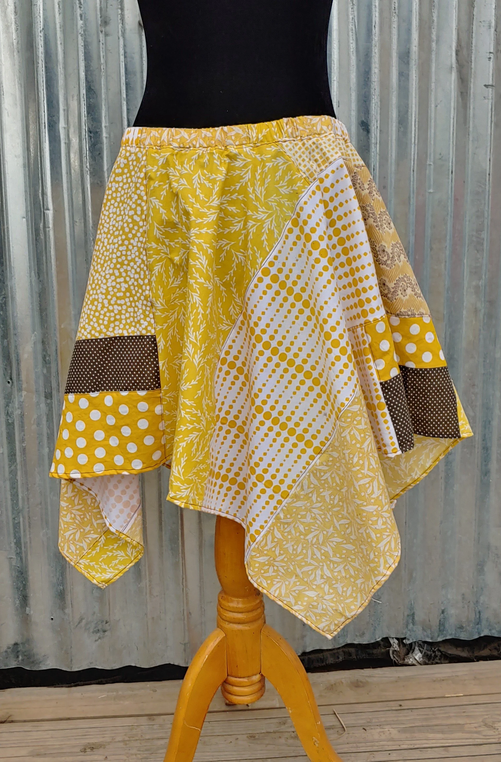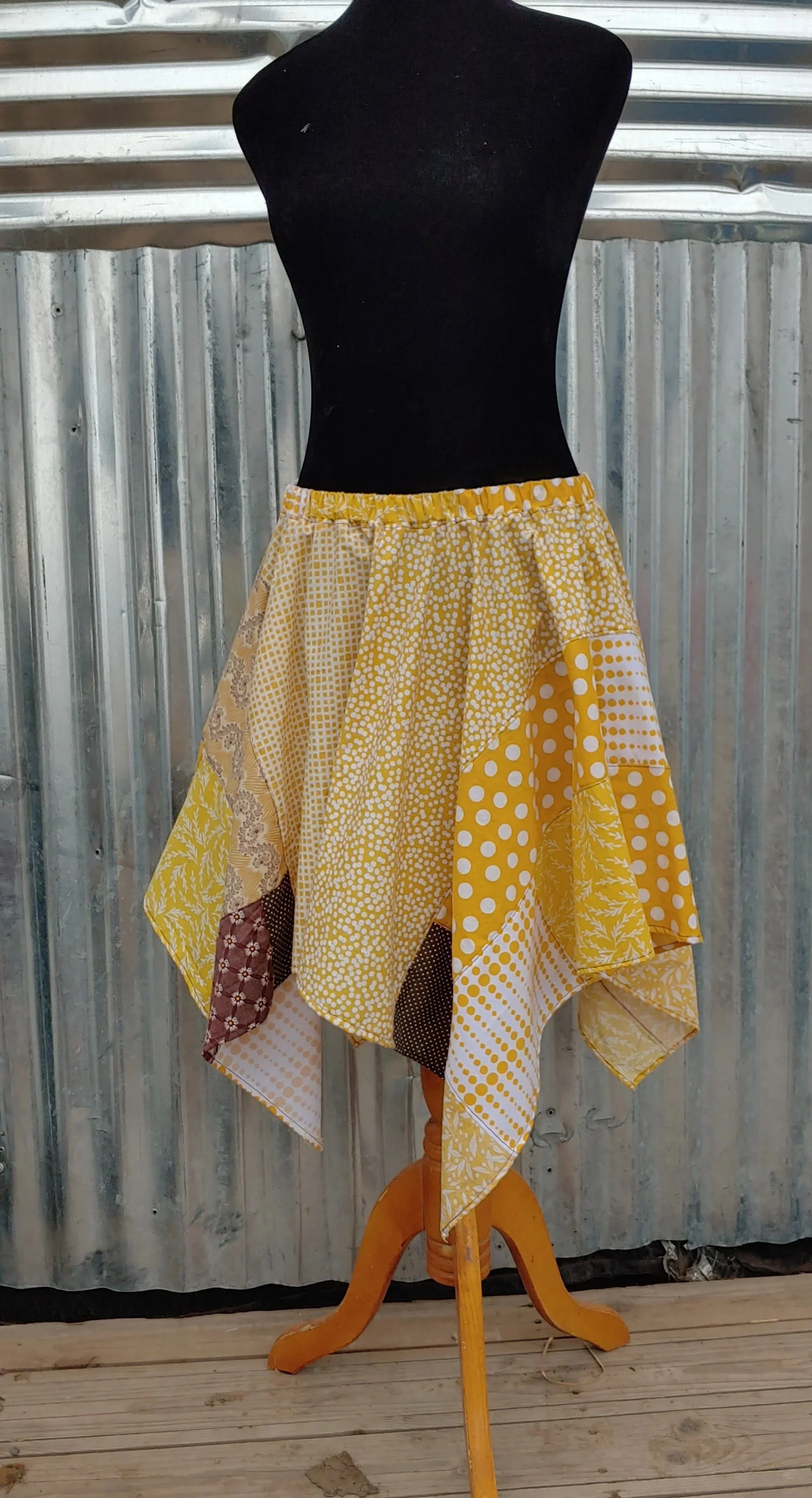 Handmade patchy peasant skirt, below knee length. Elastic waistband size medium. Floral green, red and blue gathered tiers.